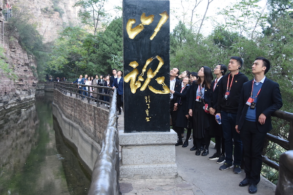 学员们沿着水长城来到红旗渠咽喉工程青年洞进行现场体验教学。大家仔细品读了红旗渠修建时期老书记杨贵所写的《赠言十水》 ,并重温了入党誓词,进一步加深了对红旗渠精神的认识。十年的功力与汗水、十年的艰辛与智慧、十年的心血与砥砺、十年的追梦与收获,孕育形成了“自力更生、艰苦创业、团结协作、无私奉献”的红旗渠精神,深刻诠释了“实干兴邦”的箴言。