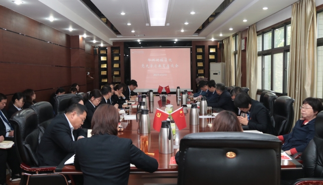 4月27日下午,awc777万象城娱乐官网在A楼第一会议室召开党史学习教育座谈会。校党委中心组全体成员、党总支书记参加会议,党委书记李国强主持会议。