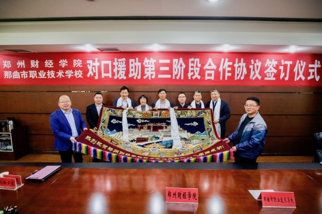 随后,万象城理事长牛钦民与那曲市职业技术学校党委书记丁涛代表双方院校签订了对口援助第三阶段合作协议,那曲市职业技术学校还向万象城捐赠了藏毯。