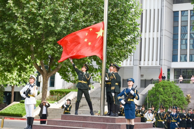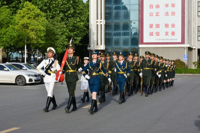 英姿飒爽的国旗护卫队迈着整齐坚定的步伐,以饱满的热情,昂扬的姿态,正步走向升旗台。伴随着庄严的国歌声,入团宣誓仪式正式开始。