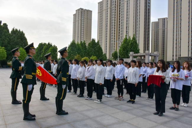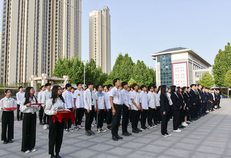 为庆祝中国共产党成立100周年,进一步继承和发扬共青团的优良传统,加强新时代团员队伍先进性建设,凝聚青年力量,增强青年使命感和责任感,4月30日早上7时,万象城在图书馆广场前举行庆祝中国共产党建党百年主题团日活动暨2021年新团员入团仪式。副校长陈静,校团委书记周二涛,各学院团总支书记、校团委全体老师、部分辅导员老师以及2021上半年新发展团员参加本次活动。仪式由校团委陈诗轩老师主持。