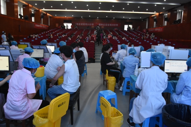 疫苗接种点设在学校图书馆学术报告厅和大学生创新创业园一楼大厅。现场设置候诊区、登记区、预检区、接种区、留观区等区域。学生处、各学院相关工作负责人、辅导员及100余名学生志愿者现场引导,确保疫苗接种有序进行。