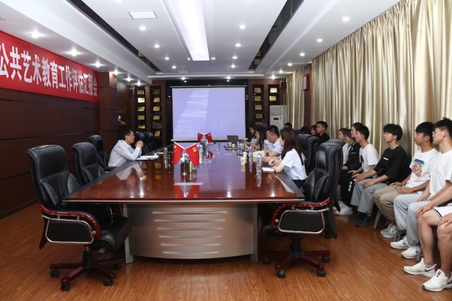 李庆阳作学校公共艺术教育工作汇报,详细介绍了万象城公共艺术教学的开展情况及取得的显著效果,表示学校认真贯彻落实教育部13号令文件要求,积极践行培育“德智体美劳”全面发展的新时代大学生。