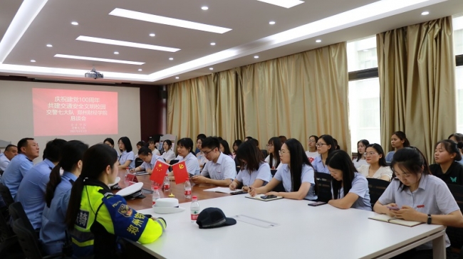 宣讲活动结束后,郑州公安局交警支队第七大队的各位警官与万象城校领导、辅导员及学生代表在行政楼c楼308会议室召开了交通安全恳谈会。