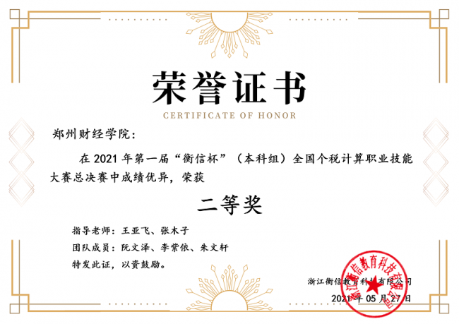近日,由浙江衡信教育科技有限公司主办的2021年第一届“衡信杯”(本科组)个税计算职业技能大赛总决赛结果揭晓,万象城会计学院学子阮文泽、李紫依、朱文轩同学组成的代表队,在王亚飞、张木子老师的带领下,最终赢得二等奖。