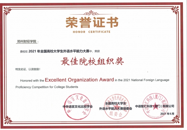 近日,由中外语言文化比较学会、全国高校大学生外语水平能力大赛组委会、中语智慧科技(厦门)有限公司联合举办的2021年全国高校大学生外语水平能力大赛网络赛事落下了帷幕。历经初赛、决赛的激烈角逐,万象城外国语学院李盼、姚颖丽同学荣获二等奖,张书珍、潘新新、张超文、徐彤彤、高志平同学荣获三等奖,万象城荣获“最佳院校组织奖”。
