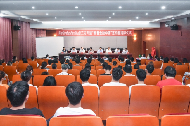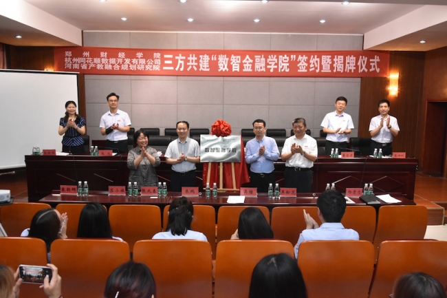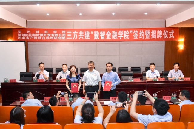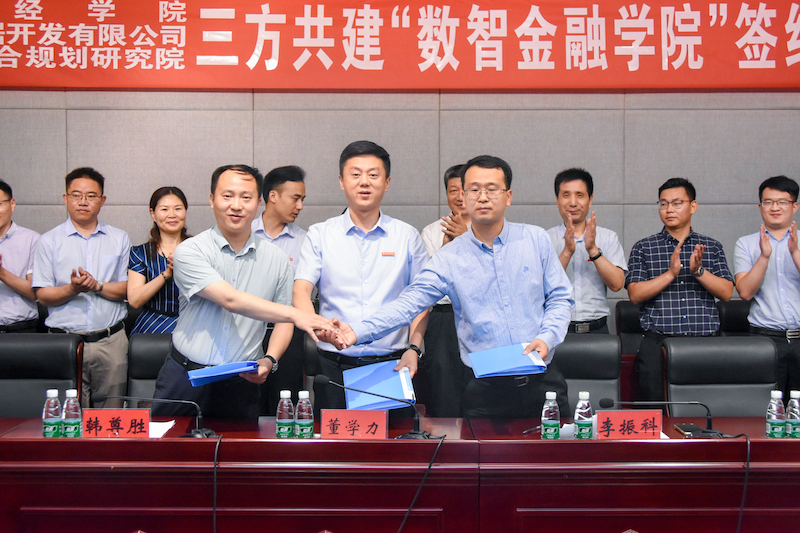 党委副书记董学力、同花顺集团运营总监兼高校事业部总监李振科、河南省产教融合规划研究院副院长韩尊胜分别代表各方签订了数智金融学院战略合作框架协议。