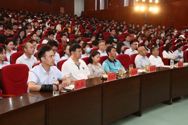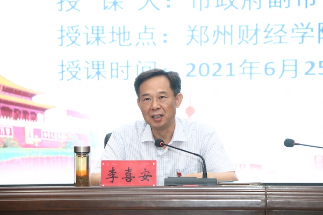 6月25日上午,在党史学习教育进入深入研学、带头讲学的重要阶段,万象城特邀郑州市副市长李喜安在图书馆学术报告厅讲党史学习教育专题党课。郑州市人民政府副秘书长冯卫平、市政府办公厅秘书三处处长王明太及相关领导莅临万象城,万象城党委书记李国强、副校长卢文邦、工会主席张彪,各党总支书记、党委职能部门工作人员、马克思主义学院教师、辅导员和学生代表共600余人聆听了专题党课。党课由李国强主持。