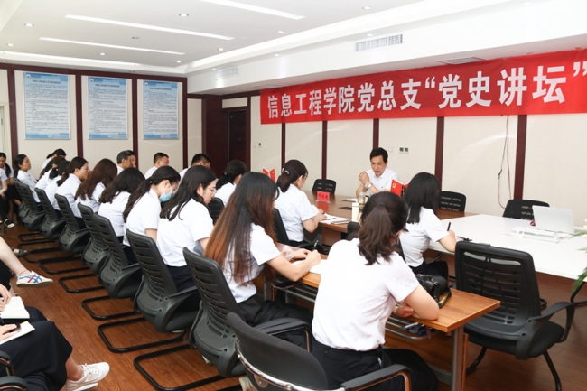 为深入推进党史学习教育,庆祝建党100周年。6月24日下午,校党委副书记、理事长牛钦民以“学党史 感党恩 铸百年教育梦”为题,为信息工程学院教师党员讲了一堂生动的专题党课。学院院长刘於勋、党总支书记袁雪霞、副书记张永、副院长刘远超、邢丹丹及教师党员代表聆听了这堂党课。