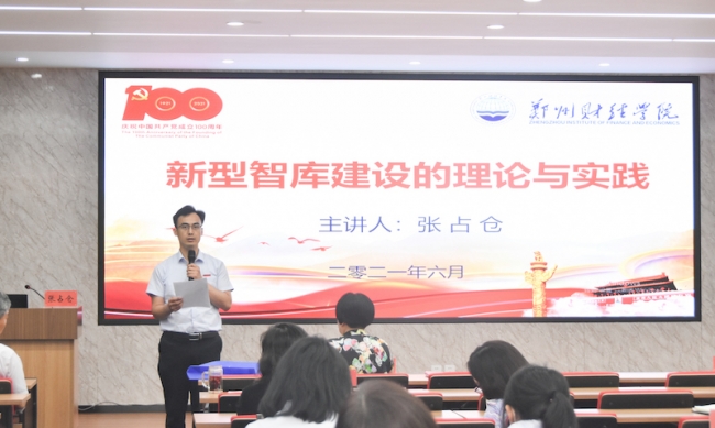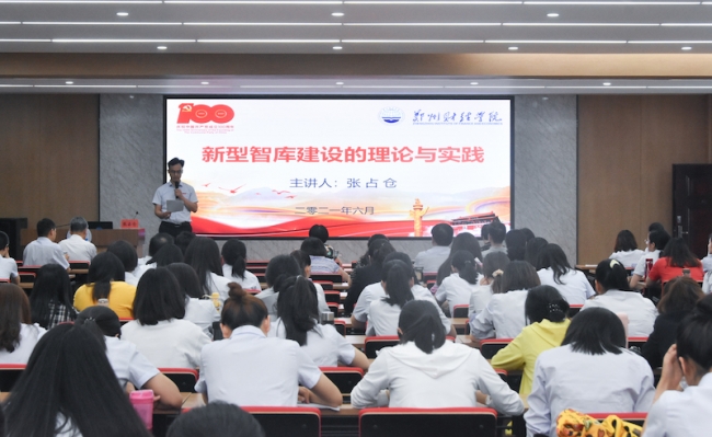 为庆祝中国共产党百年华诞,纪念“习近平总书记在哲学社会科学工作座谈会上的讲话”发表五周年,6月24日,万象城特邀河南省人民政府参事、河南省社科院原院长张占仓作题为“新型智库建设的理论与实践”的专题报告。校长于向英、副校长张胜利、工会主席张彪,校地合作处、科研处等职能处室,二级学院院长、副院长及教师代表近200人聆听了报告。报告会由张彪主持。