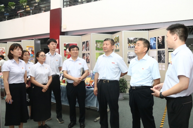 在参观过程中,于向英认真倾听了作者对作品创作过程的讲解,不时询问创作细节,尤其是对版画作品《百年印记》连连称好。《百年印记》是由100幅经典作品组成的一幅党旗,100位同学“以刀代笔”感受革命先烈们浴血奋战、不畏牺牲的英勇气概。