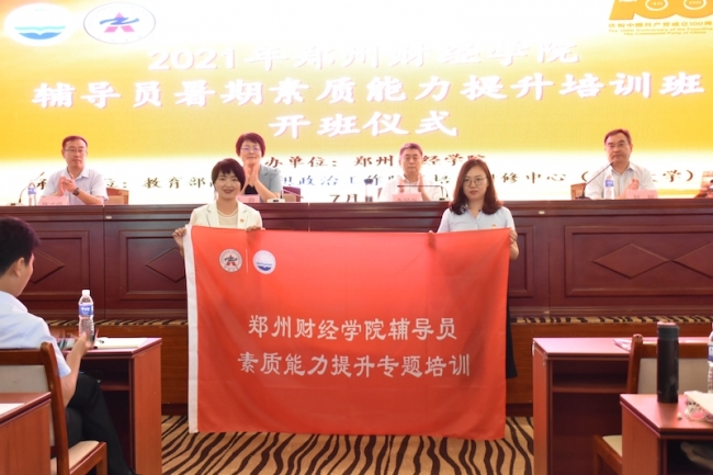 教育部高校思想政治工作队伍培训研修中心(郑州大学)办公室副主任聂娜为本次辅导员暑期素质能力提升专题培训班进行授旗,awc777万象城娱乐官网学工部副部长吕洛乐接旗。