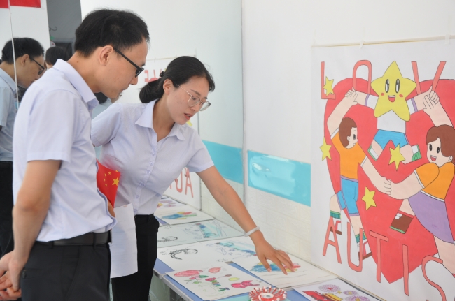 揭牌仪式后,陈静一行参观了康复教育中心的教学设施和训练教室,了解不同孩子的性格特点及学习能力等情况,向孩子们赠送了学习用品。还参与到实践团给孩子上课的过程中,对孩子们的绘画作品连连称赞。