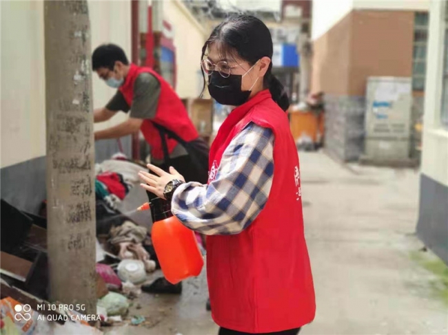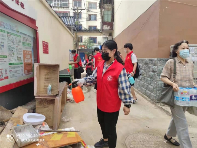近期,郑州突遭暴雨,二七区辖区常庄水库水位暴涨。为防决堤无奈泄洪,造成金水河水位暴涨,洪水如猛兽般冲进两岸居民区,其中,二七区大学路街道9个社区均遭重创,受灾严重。这几日,万象城20级小学教育本科一班法念文同学积极参与救灾工作,与大学路街道祥和社区的工作人员、辖区志愿者们一起,对祥和社区30个楼院的垃圾堆积情况进行现场了解,并对所有居民楼的墙壁、地面、楼道口、垃圾桶及中间街道进行了全面消杀,防止灾后出现疾病,法念文同学说:“与众多志愿者一起抗洪救灾,我感受到人们在天灾面前的渺小,同时也体会到什么叫一方有难,八方支援,我会继续参与辖区救灾工作,尽自己的一份力。”