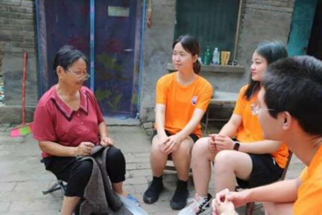 调研队成员在木兰镇听老人讲关于花木兰的故事