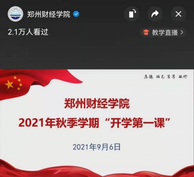 校长于向英以《笃学敏行 历练成长》为题,为全体师生讲授开学第一课。她指出,全体郑财人不但要主动投入到疫情防控和灾后重建中,更要读好“战疫”这本无字书,“把灾难当教材,与祖国共成长”,上好防汛救灾和“战疫”这堂深刻的思政大课。针对即将开展的线上教学,于向英提出四点要求,一是身居斗室,心怀理想,迅速从假期模式切换到学习状态,自觉把成长成才的责任扛在肩上、放在心上。二是千里之行、始于足下,要求取“真学问”,广泛涉猎各学科知识,增强对国情和社会的认知。三是锻造意志,坚忍不拔,勇于面对学习中的各种困难和挫折,保持强大的学习意志。四是科学防控、身心健康,做好居家防疫,服从学校疫情防控相关要求,无通知不返校。