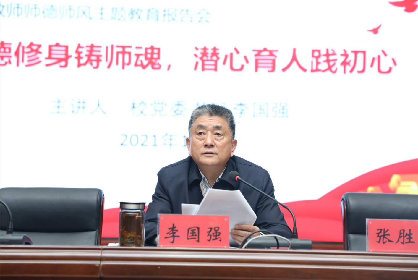李国强为全体新教师作《崇德修身铸师魂,潜心育人践初心》主题教育报告。他阐述了“崇德修身”与“潜心育人”的深刻内涵,围绕“教育的初心与使命”“教师的德行与修养”等内容,对与会青年教师进行了谆谆教诲,要求青年教师不断提升自己的政治素养、理想信念、道德修养、育人情怀,牢记立德树人的崇高使命,把“为党育人、为国育才”刻在自己职业初心与事业使命的标尺上,时时对照,叩问自省,恪尽职守,修身自学,不断进步,更好地以德立身、以德立学、以德施教。