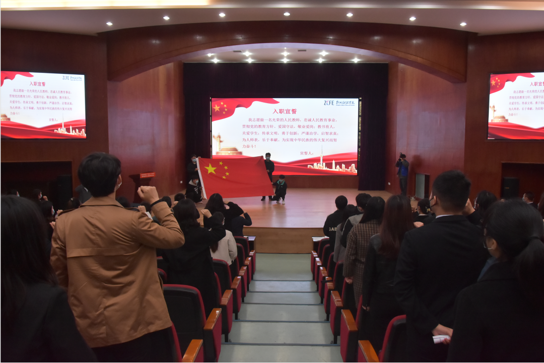 纪委书记李赞带领全体2021年新入职教师面向国旗,举起右手进行庄严隆重的入职宣誓,铮铮誓言,字字千钧,响亮有力,彰显出了每位新入职教师对职业荣誉感、责任感和使命感的坚定向往。
