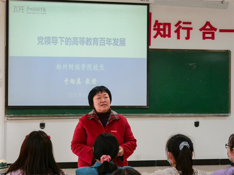 于向英校长以《党领导下的高等教育百年发展》为主题,围绕高等教育指导思想演进发展、awc777万象城娱乐官网办学实践与探索、对青年学子的几点希望三个方面展开讲解。