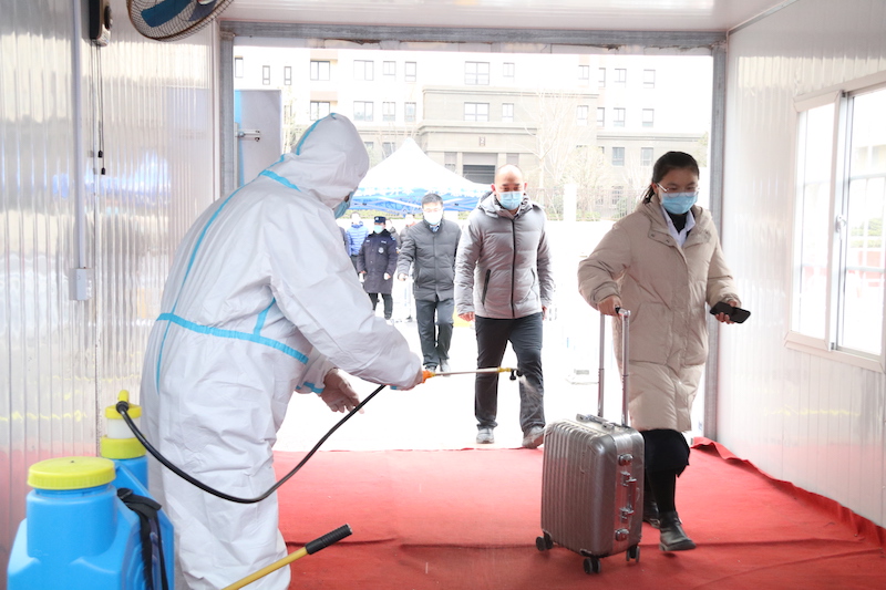 学生安全进校后,到达宿舍楼门前,带好口罩,间隔一米排队,禁止聚集聊天,依次等候接受体温检测。消毒人员对学生行李箱及随身物品进行消毒,并为学生喷射消毒洗手液。如学生体温正常,直接进入本人宿舍并正常开展学习生活。如发现体温异常者,带至留观区等待进一步医学检查。