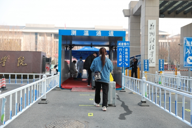 在校门口,工作人员引导学生有序排队、接受体温检测、出示健康码、在完美校园上签到、行李消杀……把好入校第一关,筑牢校园安全防线,为回校师生保驾护航。