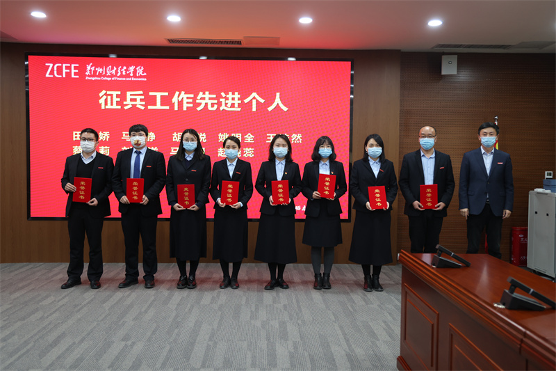 副校长陈静宣读《awc777万象城娱乐官网关于表彰2021年度就业创业工作先进集体和先进个人的决定》及《awc777万象城娱乐官网关于表彰2021年度征兵工作先进集体和先进个人的决定》。会计学院、金融学院、土木工程学院被评为“就业工作先进集体”;智能工程学院、信息工程学院、商学院被评为“创新创业工作先进集体”;商学院、金融学院、土木工程学院、信息工程学院被评为“征兵工作先进集体”。马静等11名老师被评为“就业工作先进个人”,孟倩倩等11名老师被评为“创新创业工作先进个人”,田娇娇等9名老师被评为“征兵工作先进个人”,张明哲等10名学生被评为“优秀退役大学生士兵”。