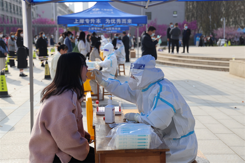 学校组织全体在校师生开展核酸检测,检测现场秩序井然,参检学生自觉佩戴口罩,十人一组,间隔一米距离,分批有序进行核酸检测采样。医务人员身着防护服,佩戴口罩、护目镜和医用一次性手套,严格按照检测规范流程进行信息核对和核酸采样。工作人员在现场进行宣传引导,提醒参检人员做好个人防护,避免聚集和相互交谈,防止采样时交叉感染。