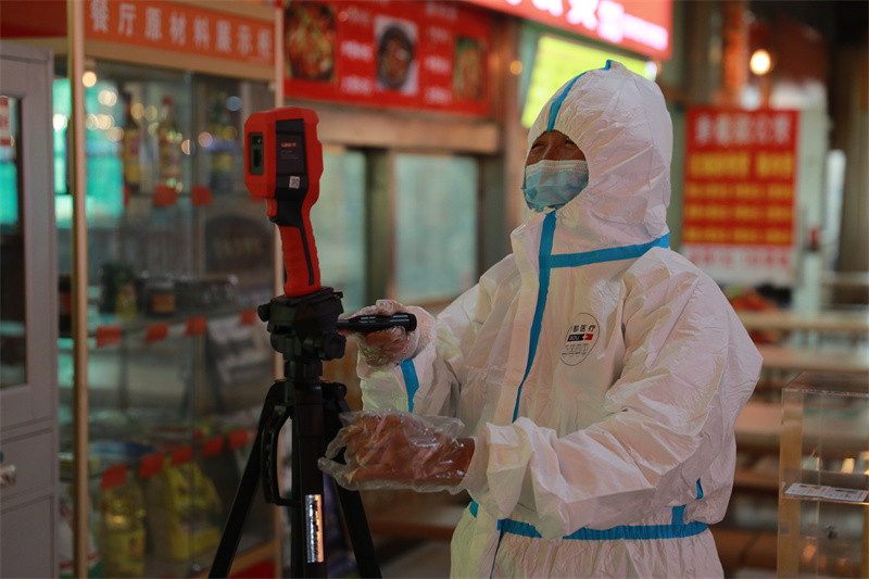核酸检测结束后,学校工作人员身着防护服,对足球场、文化广场等核酸检测点重点区域进行大面积、全方位、无死角消杀。