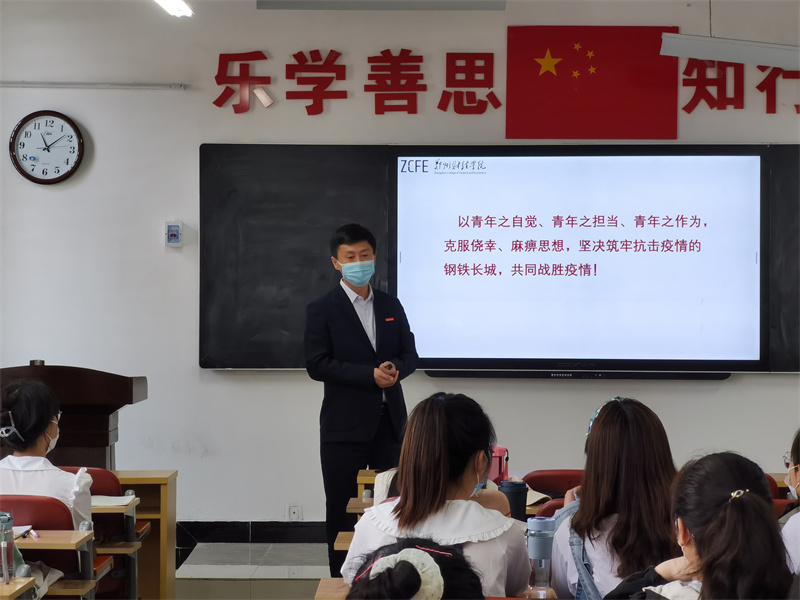 董学力以《共克时疫 青春有我---弘扬抗疫精神 践行责任担当》为主题,围绕全国、河南省、郑州市的疫情蔓延情况,讲授了疫情之下全国人民万众一心、同舟共济的伟大抗疫精神,并与同学们亲切交流,深入了解了疫情期间同学们的学习和生活情况,针对同学们遇到的问题和疑惑耐心进行了解答。