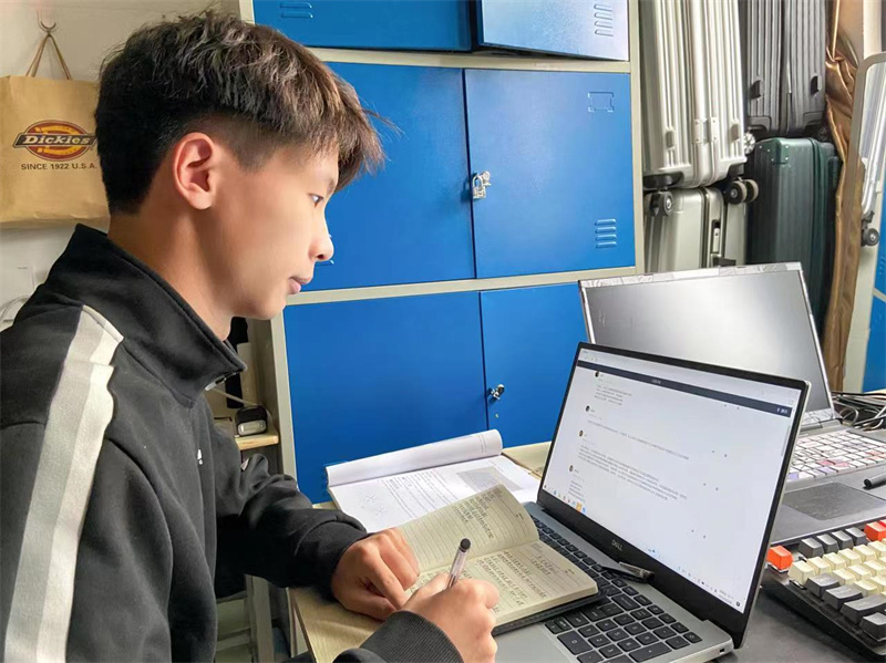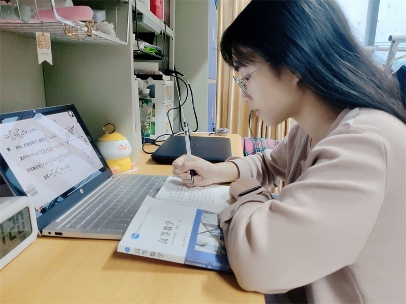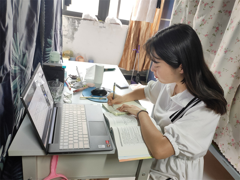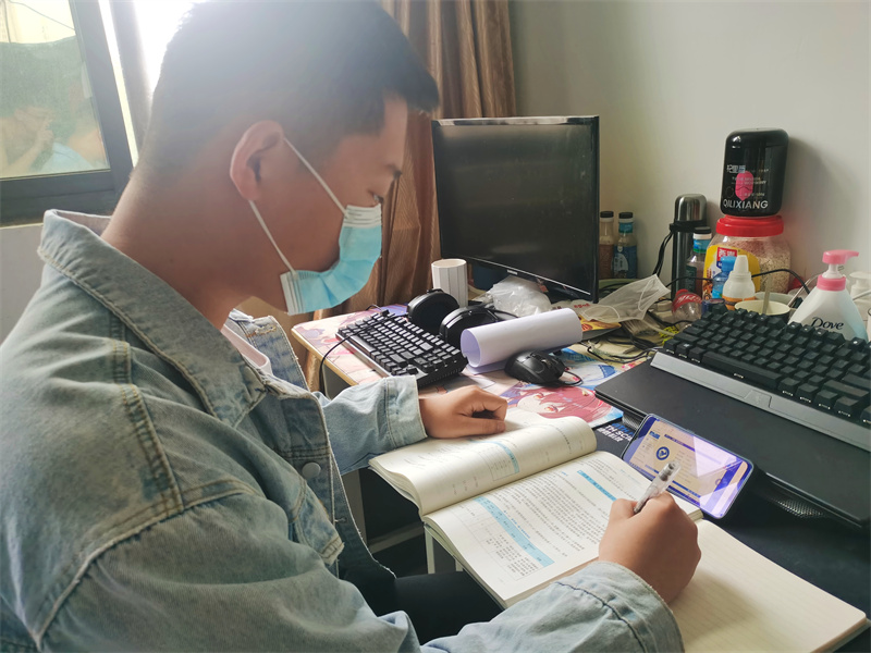 55日起,学校积极响应市疫情防控要求,启动线上教学,学生们在宿舍进行线上学习。虽然因为疫情,师生们无法“相聚”在教室,但是老师们不减严谨的教学态度,学生们不减饱满的学习热情,师生之间“云端”互动频繁,“云上”课堂也井然有序。网课过程中,我们通过发文字、发语音、视频连麦等多种方式参与课堂互动,课堂活跃度大大提高,同学们丝毫没有因为冰冷的屏幕而降低学习热度,大家反而更加情绪高涨,很多在线下课堂上因为内向平时不敢发言的同学也积极主动回答问题,各抒己见,课堂氛围非常好。在室友的陪伴和监督下,我们都能够很好地约束自己,自制力也有了很好的提升,把寝室当成教室,用心对待每一堂课。课下大家都会一丝不苟地完成课堂作业,认真对待每一项任务,让自己在每一节课都能够有所收获,有所提升。