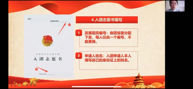 薛子豪老师以《基础团务与智慧团建系统的使用》为主题,围绕发展团员的标准流程、《中国共产主义青年团入团志愿书》填写说明及规范、新团员入团仪式、智慧团建操作等常见问题进行了详细的讲解。