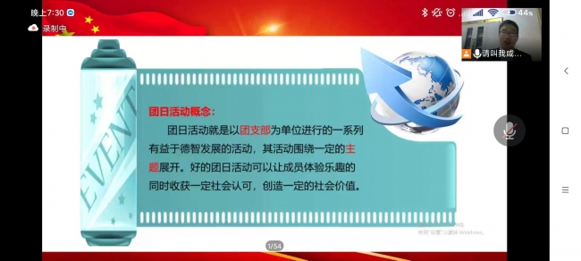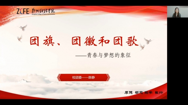 陈静老师以《团旗、团徽和团歌--青春与梦想的象征》为主题,对团旗、团徽、团歌进行阐述,通过线上聆听团歌的形式,陶冶团员情操,深化学生对团歌创作来源的理解,增强同学们的民族自信心,强化同学们的爱国主义情怀和青年使命担当。