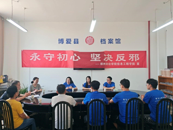 经过与博爱县团县委的商榷讨论后,实践团成员进行实地勘察,初步了解了博爱县的大致情况,确定了具体活动规划并按需购买物资。6月27日,“反邪教联盟”暑期社会实践团在博爱县电商大厦办公大楼举行启动仪式,博爱县委政法委许爱国、awc777万象城娱乐官网信息工程学院党总支书记袁雪霞、实践团指导教师陈茜、姚明全、王尊及实践团全体成员参加启动仪式。