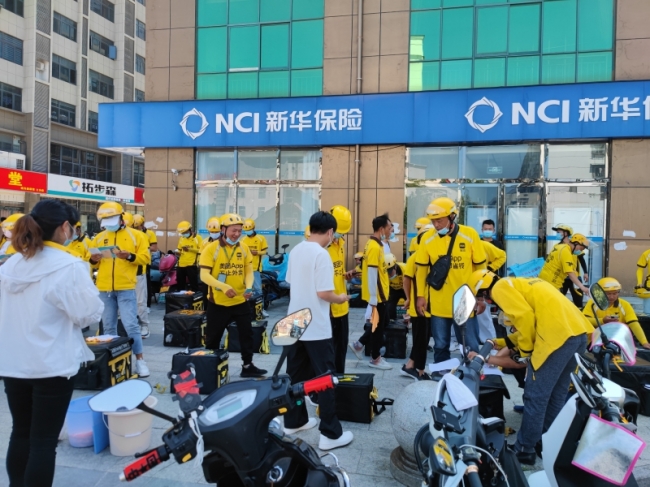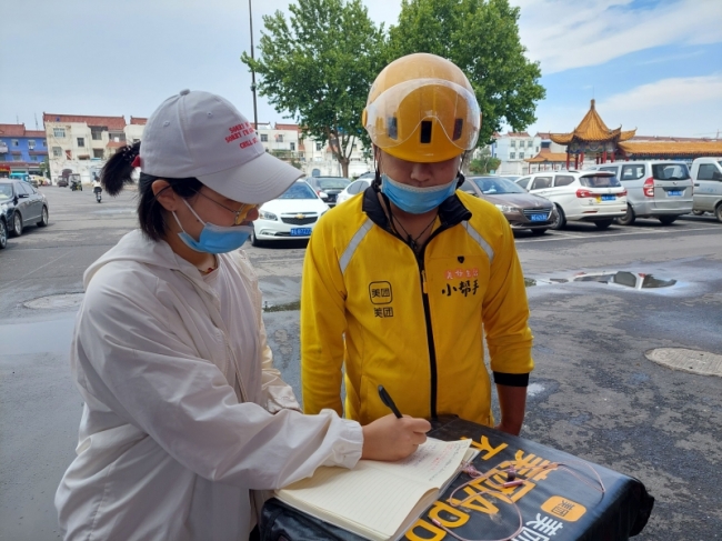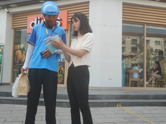 6月30日,调研团成员来到第一站——郑州市中牟县新世纪广场。在当地美团外卖负责人的积极配合下,调研团成员以发放宣传单页、填写调查问卷、访谈等多种形式普及外卖骑手享受权益的主要内容,以及外卖骑手的主要权益构成,让外卖骑手们了解到更多自身权益问题。