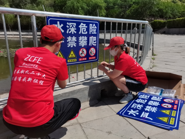 会计学院“小绿伞”防溺水暑期社会实践团成员安装防溺水安全警示牌