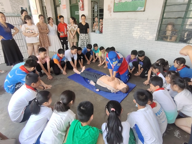 会计学院“小绿伞”防溺水暑期社会实践团通过传授心肺复苏知识、利用乡村广播宣传等方式构建社会化群防共管机制,共筑暑期儿童安全防线。