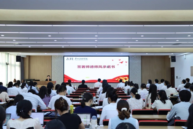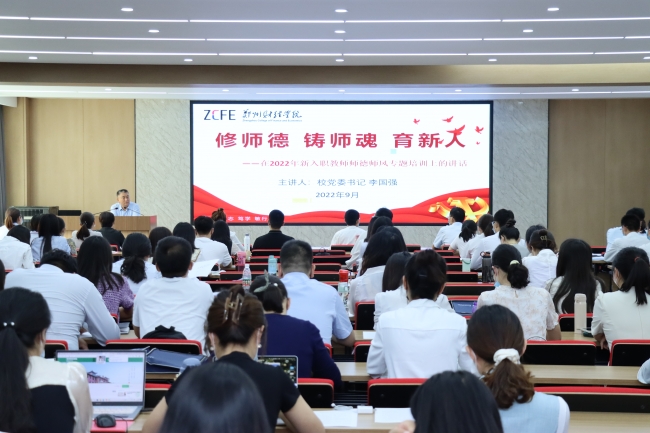 李国强为全体新教师作《修师德 铸师魂 育新人》主题教育报告。他以师德师风为主题,以爱党、爱国、爱教、爱校为主线,向参会教师阐述了“教育的初心与使命”“教师的德行与修养”的深刻内涵。他对青年教师提出三点要求,一要突出政治标准的首要地位,二要明确职业道德的高线要求,三要永葆爱生育人的浓厚情怀,勉励青年教师争做新时代的“大先生”。并建议青年教师用好“两个渠道”,落实好新教师培训计划,虚心向导师求教,积极参加各类教育教学活动、培训活动、科研活动,尽快站稳讲台;了解学校教师培养的相关政策举措,利用好分层培养政策和各类专项计划,明确个人发展目标,做好个人职业生涯规划,服务学校发展,实现自我价值。他希望加入郑财大家庭的青年教师,能够在郑财这片热土上辛勤耕耘,在推动学校事业发展的实践中增长才干、建功立业!