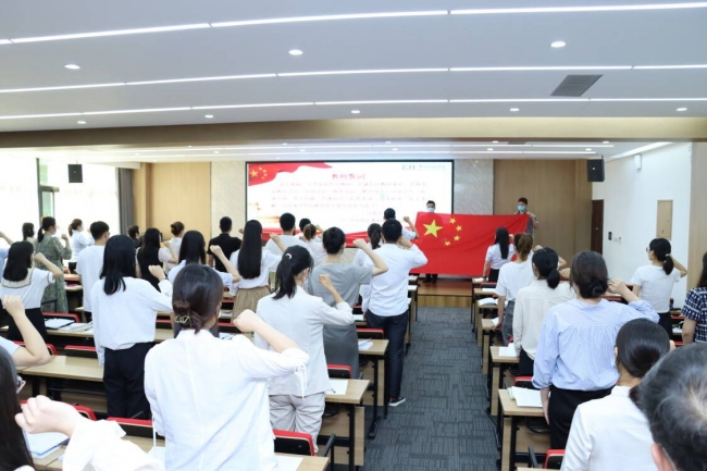 在教师发展中心副主任周晓瑞的带领下,2022年新入职教师面向国旗举起右手庄严宣誓,铿锵誓言,掷地有声,传递着奉献教育的坚定决心,宣告着教书育人职业生涯新征程的开启,点燃了每位教师心中强烈的荣誉感、自豪感和使命感。
