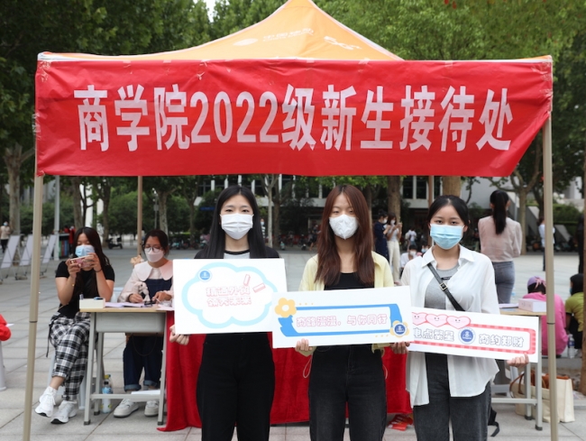 商学院的新生报到处,在迎新工作人员的引导下,新生一边拍照打卡,一边在白板墙上写下自己对大学生活的期许。