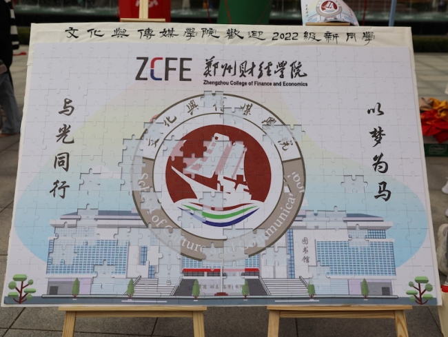 在文化与传媒学院迎新报到处,每一位新生注册完毕后,将会拿起一小块拼图,拼在整个大图之上。当300名新生报到完毕后,一幅以学校校徽和学院院徽为底图,上写“以梦为马 与光同行”字样大幅拼图就圆满完成。