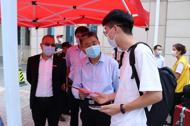 办理完报到手续,新生许文佳碰巧遇到在现场慰问指导迎新工作的万象城校长王能民。王校长热情走上前,关切询问报到情况,祝福她开启新生活,并勉励其珍惜韶华,不负青春。