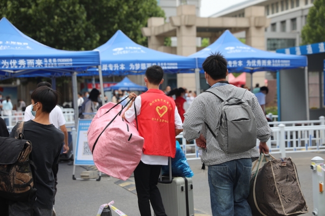 办理完报到手续,放下行李,智能工程学院的新生王邓菠立刻就回到学院迎新帐篷前,当起了志愿者,引导新生报到,帮助新生提拿行李。