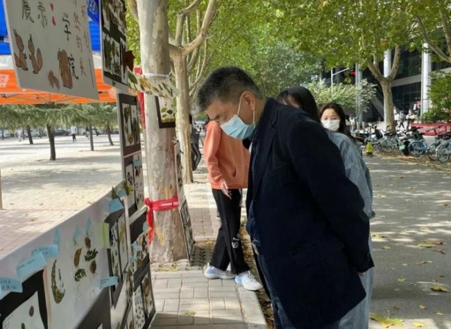 秋风中,一幅幅充满创意的落叶画作随风飘摇,让更多学子感受到秋天的魅力,为秋日着迷。路过的郑财师生纷纷写下一句句秋日寄语,粘贴在他们喜欢的作品下。