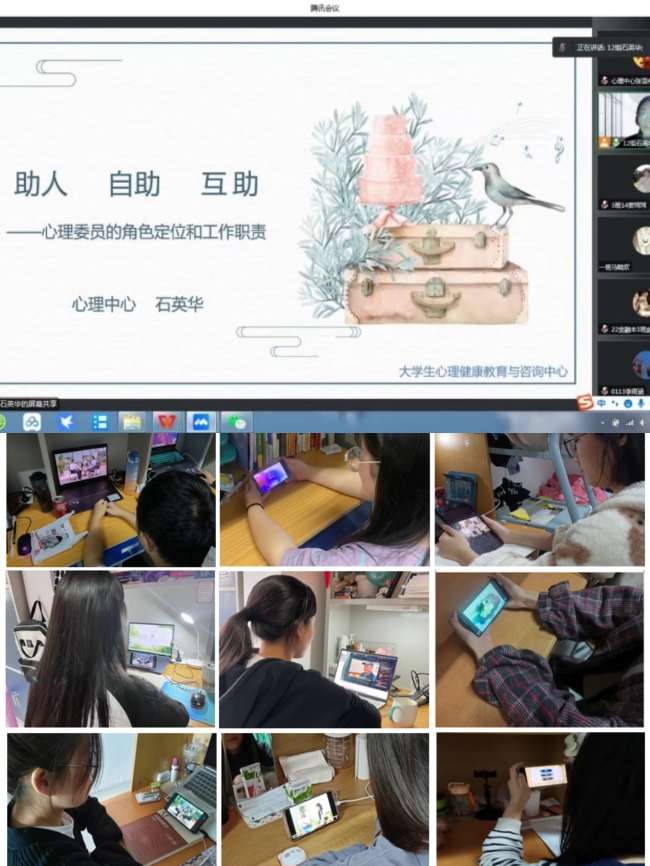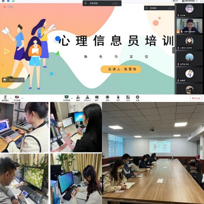 心理信息员是万象城心理四级工作网络中最基础的一环,为充分发挥其工作网络的基础功能,心理中心开展了心理信息员线上培训,本次培训由心理中心老师张雪伟主讲。通过培训,心理信息员明确了自身的工作职责,进一步提升了心理健康素养,并表示会积极配合班级心理委员宣传普及心理健康知识,增强宿舍同学的心理健康意识和心理自助能力。