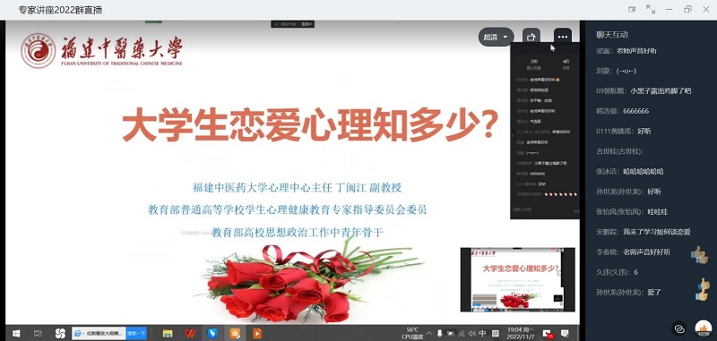 为普及心理健康知识,心理中心特邀福建中医药大学心理健康教育指导中心主任丁闽江副教授,以《大学生恋爱心理知多少》为主题开展线上直播讲座,线上观看人数4000人次,点赞达20万,直播现场互动频繁,气氛轻松愉悦。本次直播讲座不仅是一堂恋爱课,更是一堂情绪疏导课,及时回应了学生们的心理需求。