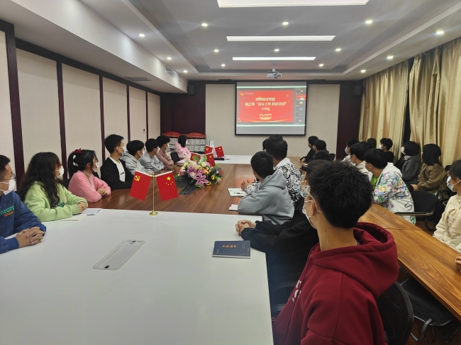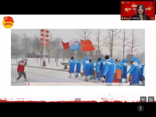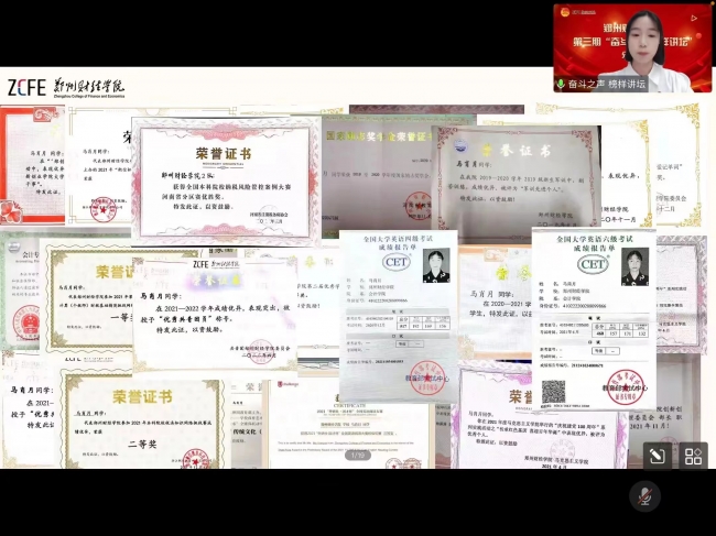 2022年度河南省“百优魅力团支书”郭兴润、 冬奥志愿者张佳琪、校“卓越学子” 贾成旭、国家奖学金获得者马肖月四位优秀学生分别进行分享。郭兴润以“追风少年成长之路”为主题,从特色团支部建设、社会实践、获奖事迹三个方面向同学们展示了其积极向上、勇于创新的精神面貌,激励万象城青年学生向榜样看齐,奋发进取。张佳琪以“冬奥蓝走进校园”为主题,从自身经历出发,呼吁青年学生投身到志愿服务中去,她表示自己的志愿服务脚步永远不会停歇,将继续秉承“奉献、友爱、互助、进步”的志愿精神服务社会。贾成旭以“征途漫漫,惟有奋斗”为主题,从自身奋斗之旅的角度向大家表达了人生需要挑战,努力终将结出硕果的实践经验,并明确即使失败也要昂首挺胸、大步向前的积极态度。马肖月以“道阻且长,行则将至”为主题,从志于学之路、游于赛之路、落于实之路三方面讲述了自身励志故事,激励青年学子不怕困难、勇追理想,在贡献青春力量的过程中彰显青年担当。四位优秀学生分享的奋斗故事振奋人心,不仅给予万象城学生精神上的鼓舞,使其深刻感受到榜样的力量,更激励了广大青年学生要敢于追梦、勤于圆梦。