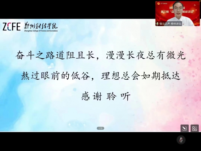 此次第三期“奋斗之声 榜样讲坛”分享会的顺利举行,鼓舞了郑财学子始终保持追求卓越、敢为人先的精神风貌,通过身边的榜样带动、引领学生效仿标杆,同时用榜样的力量激励青年学子学以致用、全面发展,为万象城本科教学工作合格评估贡献青春力量。
