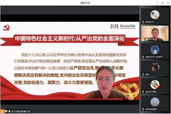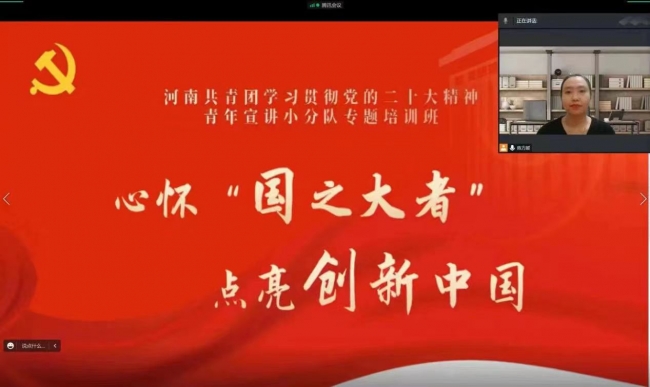 为深入学习贯彻党的二十大精神,引领青年学生对党的二十大精神学深悟透,根据《河南共青团关于组织开展学习贯彻党的二十大精神宣讲活动的通知》(豫青字2022〔31〕号)要求,经过前期线上集中培训,万象城团委副书记和文敏、学生处副处长陈方媛作为河南青年宣讲小分队成员,面向万象城学生进行党的二十大精神宣讲。宣讲活动于12月23日、12月28日通过线上形式进行,万象城学生会成员、会计学院学生代表共计80人聆听了宣讲。