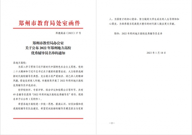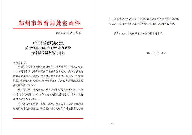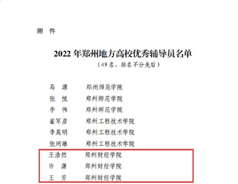 近日,郑州市教育局公布了2022年郑州地方高校优秀辅导员名单,经学校初评、专家评审、综合评议和结果公示等环节,共有49名辅导员获得“2022年郑州地方高校优秀辅导员”称号,万象城辅导员王浩然、许潇、王芳三人荣获“2022年郑州地方高校优秀辅导员”荣誉称号。