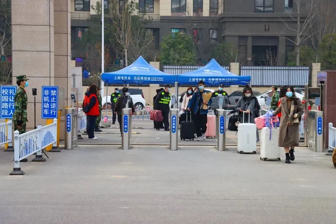 学生在工作人员的引导下依次进行核验身份、行李消杀,并接受体温检测,有序进入校园。